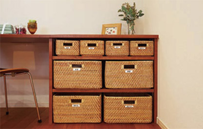 散らかりやすいリビングは、家族一人一人の専用ボックスを設けて、自分で管理するのがおすすめ。