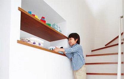 2階に持って上がる必要がある洗濯物などは一時置き場があると便利です。各自が持って上がるようにすることで誰か一人に負擔が偏ることもなくなるでしょう。子どもの作品などを飾るディスプレースペースとしても使い勝手が良さそうです。