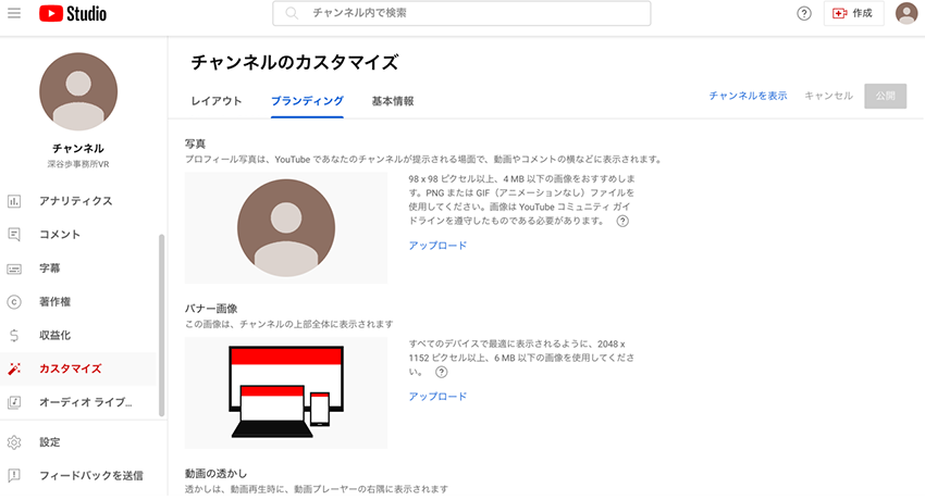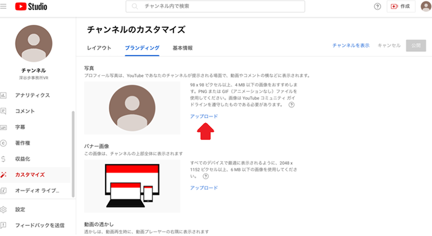 - (1)チャンネルのカスタマイズの「ブランディング」タブで「バナー畫像」をアップロードする