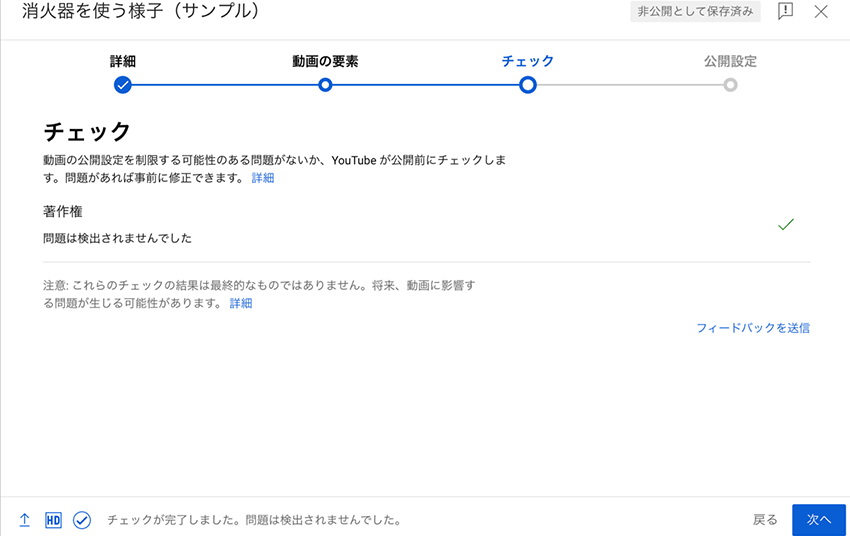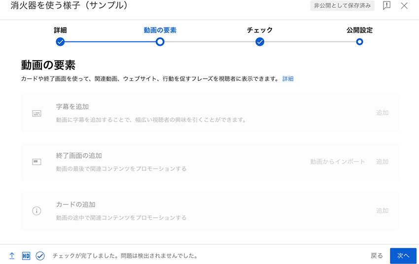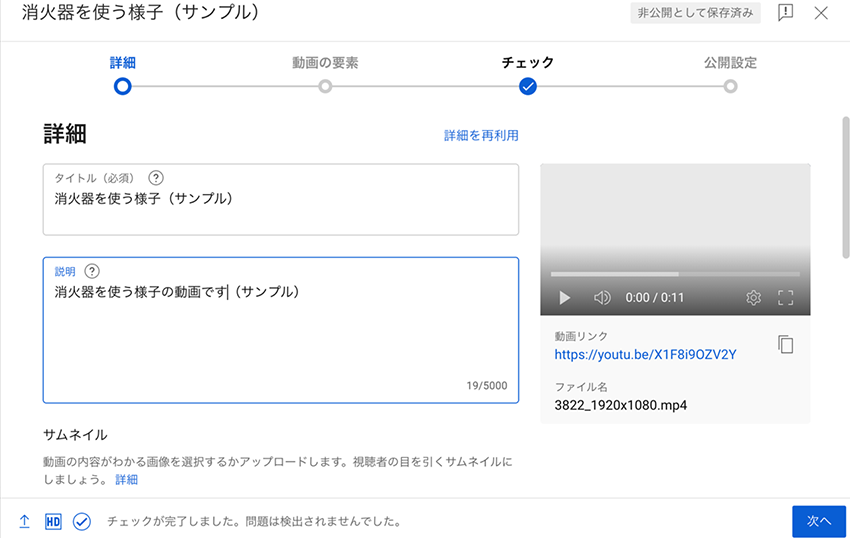 - (3)動(dòng)畫の詳細(xì)を入力し(動(dòng)畫のタイトル、説明文、サムネイル、再生リスト、視聴者を設(shè)定)「次へ」をクリック。