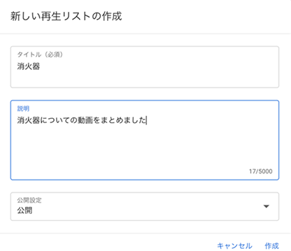- (3)新しい再生リストのタイトルと説明、公開範(fàn)囲を設(shè)定し「作成」をクリックする