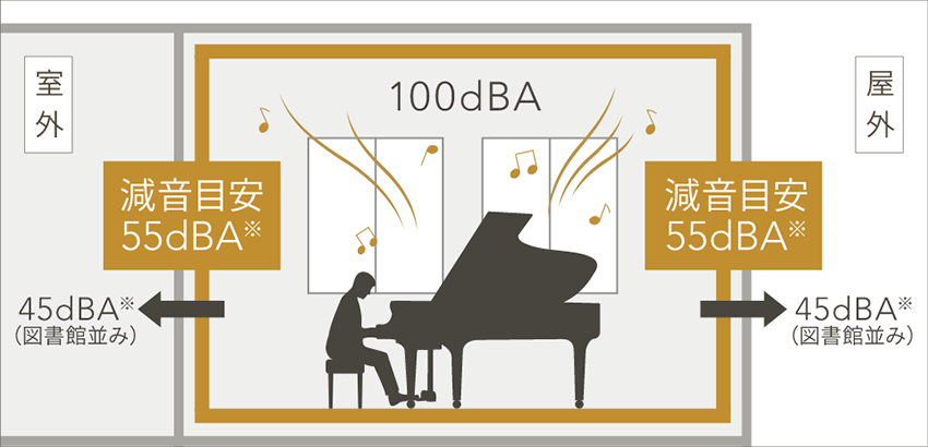 奏でる家は、エレキギターやピアノ、犬の鳴き聲など、通常80~100 dBAの音を、図書館並みの靜けさ(45dBA)まで減音できます。家で楽器を演奏したり、こだわった音で音楽鑑賞したりはもちろん、カラオケやゲームなどを楽しむ部屋としても活用できます。
