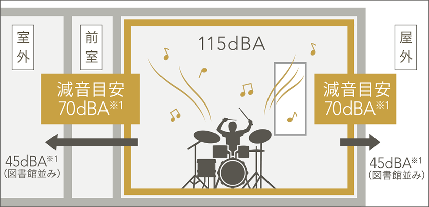 「奏でる家+」は、室內(nèi)でのドラム演奏など、通常115dBAの音を図書館並みの靜けさ(45dBA)まで減音できます。ドラム演奏はもちろん、自宅でのバンド演奏など、大音量の演奏も可能です。