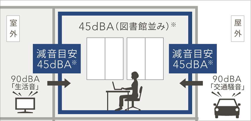 音の大きさに合わせて、それぞれ図書館並みの靜けさ(45dBA)まで減音できるのが特長(zhǎng)です。