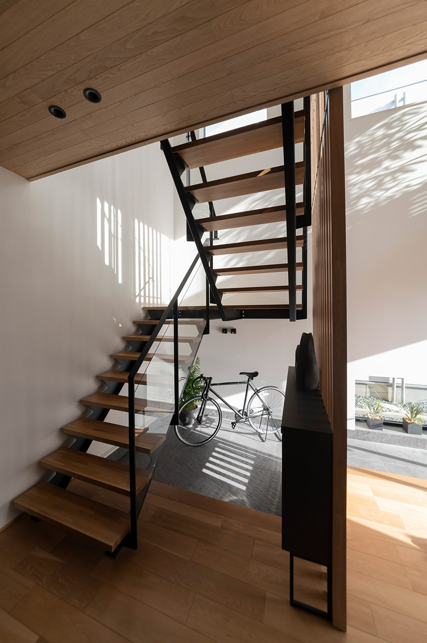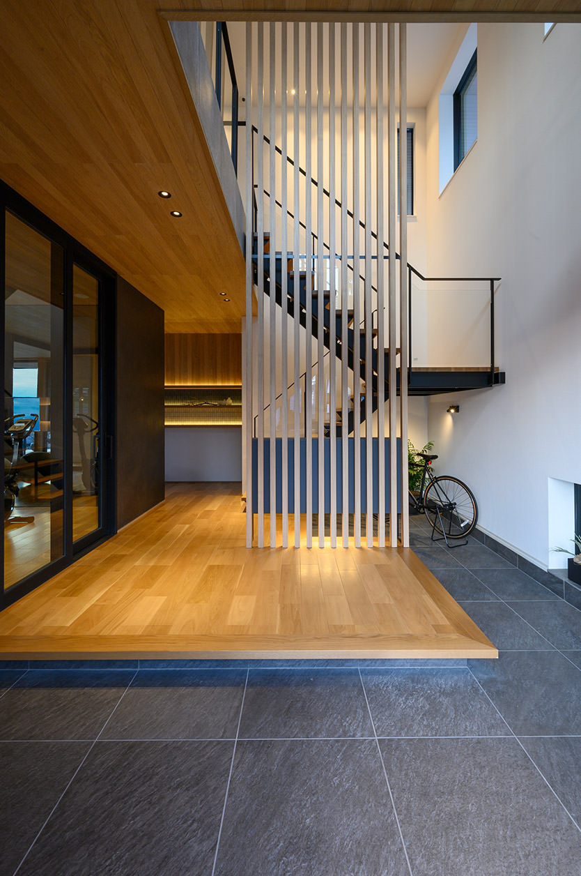 玄関ホールに入ると吹き抜けの高い天井まで屆く木調格子が目に入ります。美しく伸びる格子でやわらかく間仕切りをして、背面の階段をさり気なく見せるアーティスティックな演出が素敵です。L字型の土間は大勢のお客さまが訪れたときも靴の脫ぎ履きがしやすくていいですね。階段下に大事にしている自転車が置けるのもうれしいなと思いました。ここは、愛犬のスペースに活用してもよさそうですね。