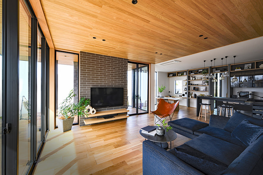 「美しい木目とやさしい色合いのオークを床と天井に用い、サッシ枠などの黒色で引き締めたインテリアが好評です。床から天井まである“グランフルサッシ”の窓から、深い庇越しに安定した柔らかな光がふんだんに差し込む心地よい明るさも體感していただきたいですね。アクセント壁にはニューヨークの地下鉄の駅をイメージさせるサブウェイタイルを張って都會的なニュアンスを出しています」