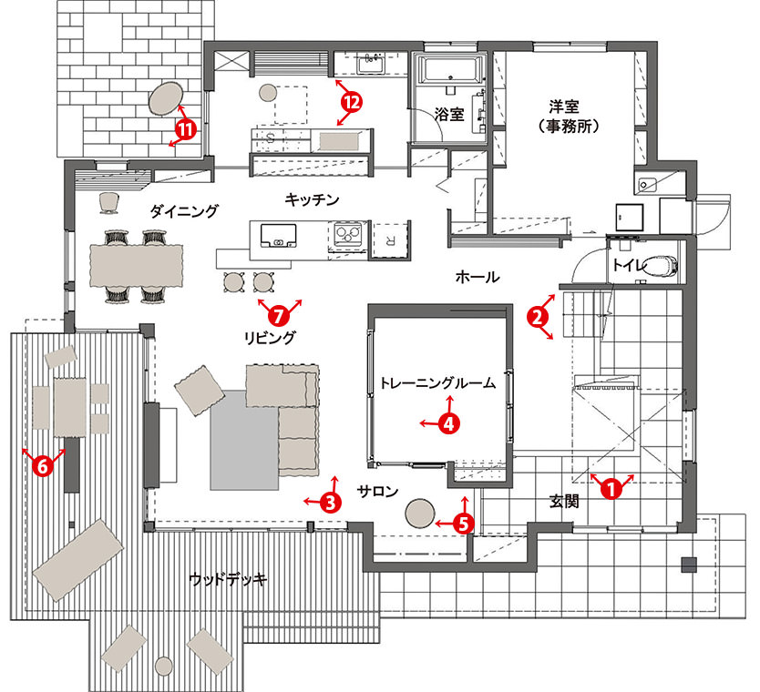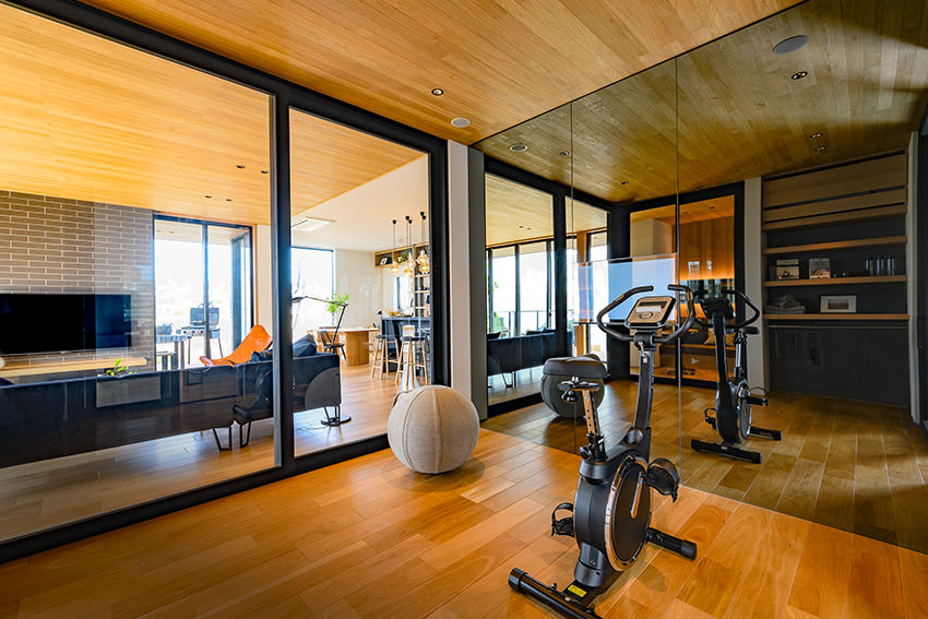 家の真ん中にトレーニングルームがある暮らしって、ちょっと意外だけれど、日常を想像するとうれしくなりませんか?音楽はもちろん、モニターで映像も流せるようになっています。自宅で気軽にトレーニングできるこんな環境があれば、子育てなどでジムに通う時間が取れなくてもストレスが解消できそう。筋トレやエクササイズバイク、ミラー張りの壁はヨガにもうってつけです。近所のママ友を呼んで、一緒にヨガをするのも楽しそう。ガラス張りだからトレーニング中もリビングの家族と一緒に過ごしている気分になれて、孤獨感を感じなくてすむのもグッドですね。