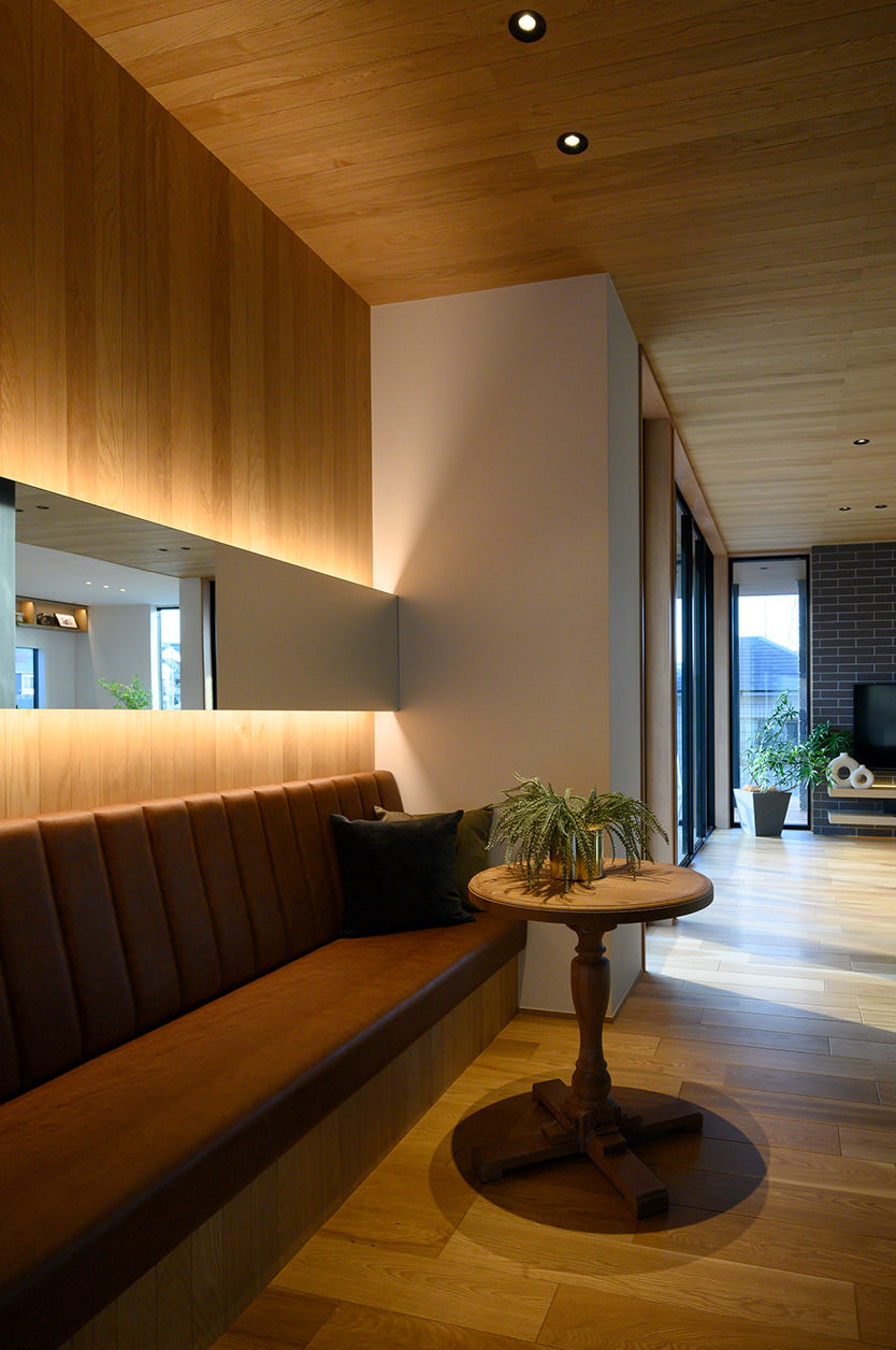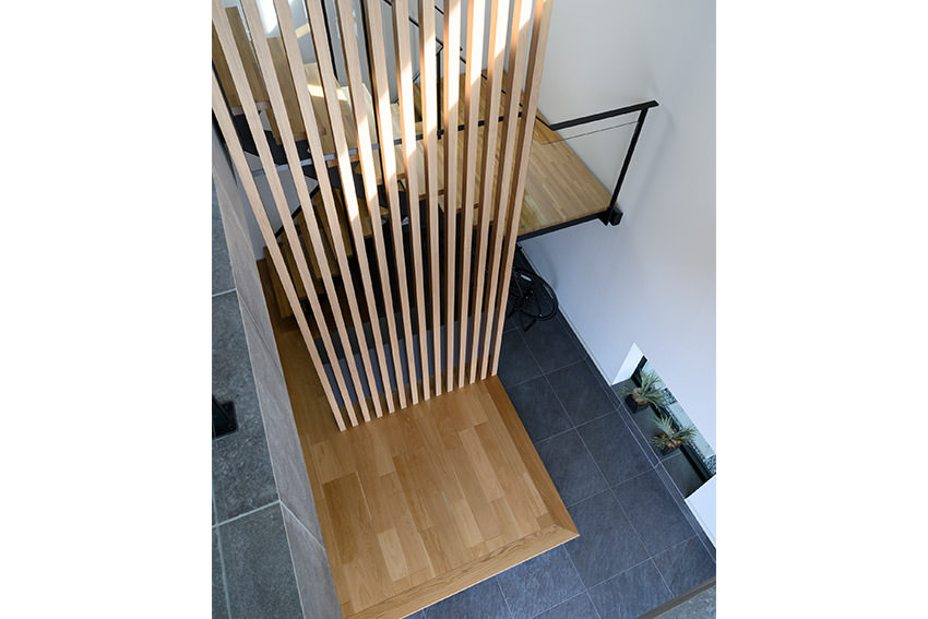 「晝と夜で表情が変わるのも、こちらの玄関ホールの魅力です。夜に階段壁の照明をつけると、木調格子から明かりが漏れて、ちょっと幻想的な雰囲気になります。入り口付近よりも空間の奧の方の照明を明るくすることで、人に安心感を與えて先へと導く“サバンナ効果”も採り入れています」