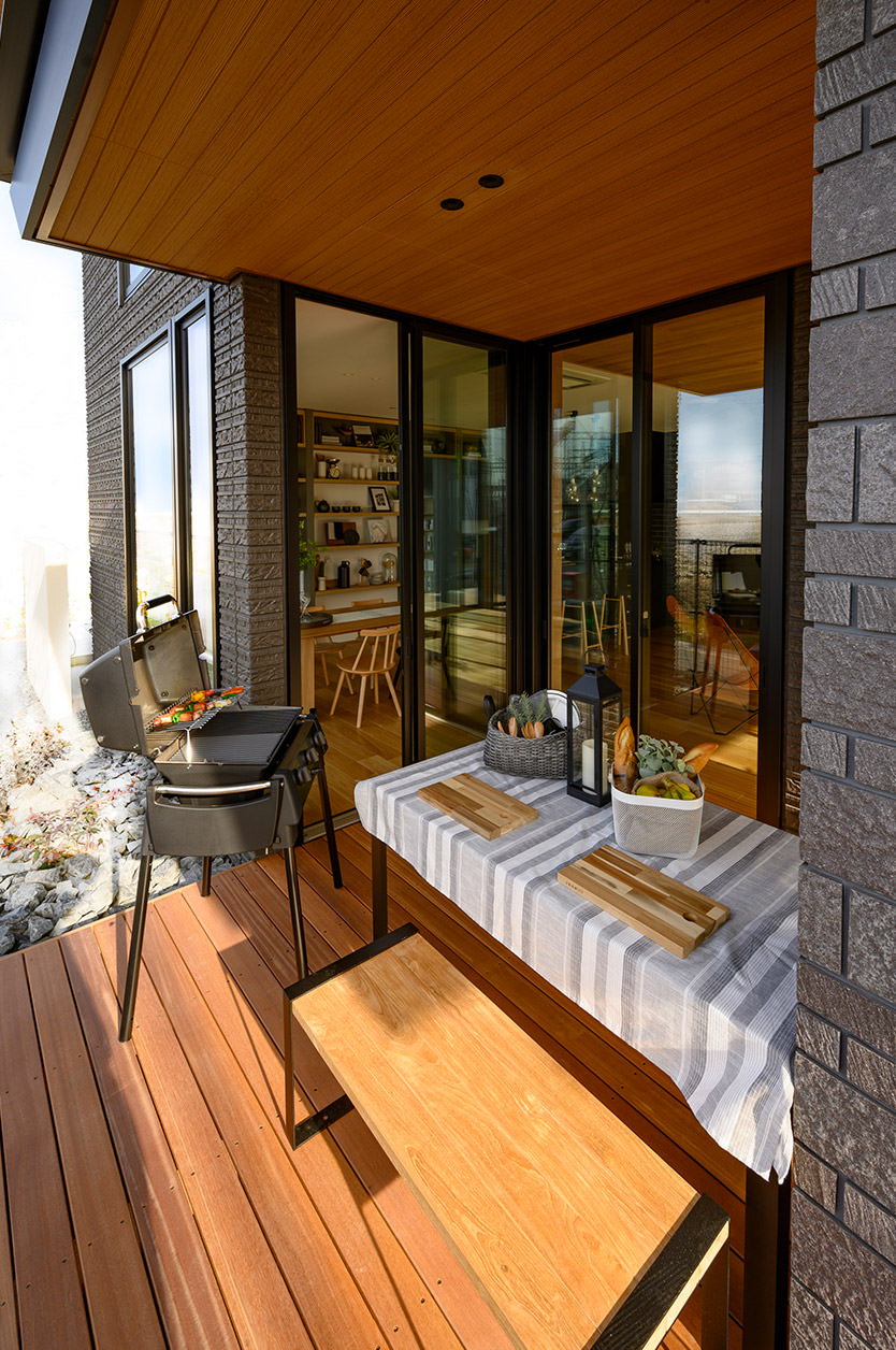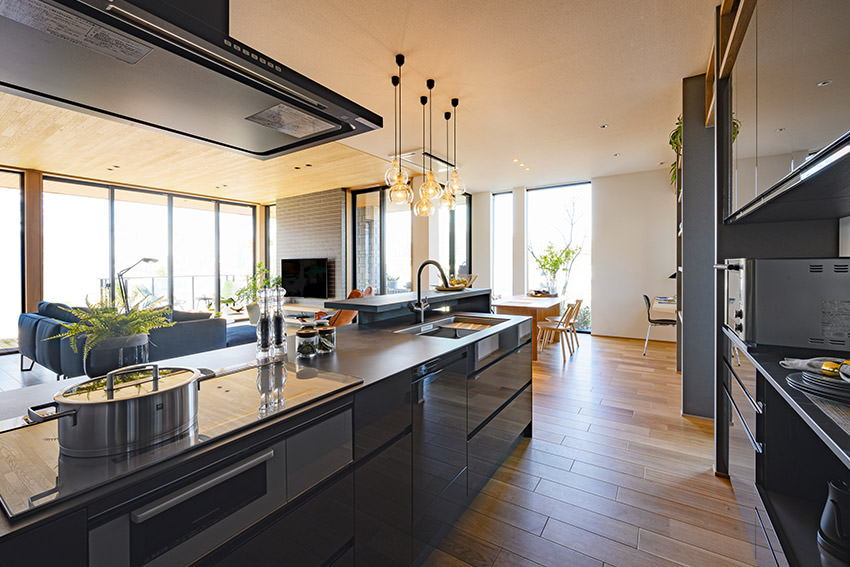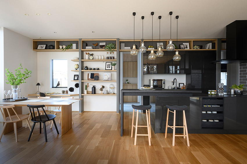 ダイニングキッチンは、みんなが自然に集まってきそうなカジュアルな雰囲気がいい感じ。墨色のシックなアイランドキッチンにカウンターがつながっていて、6連のガラスペンダントライトがおしゃれです。親子や夫婦で一緒にクッキングをしたり、友達を呼んでホームパーティーを開きたくなりそう。調理をしている人とお喋りしながらカウンターで味見をするのも楽しいかも。ダイニングから続くウッドデッキはバーベキューコーナーになっているから、天気の良い日は気軽に“お外ごはん”ができますね。普段の暮らしでリゾート気分を味わえる、そんな幸せな日常が目に浮かびます。