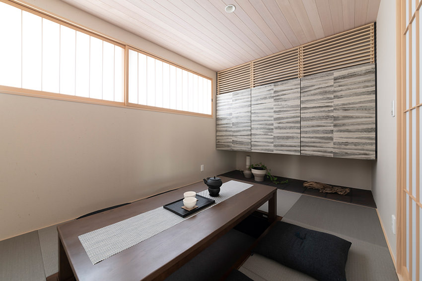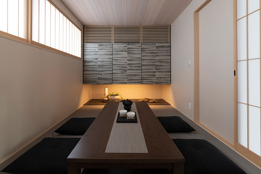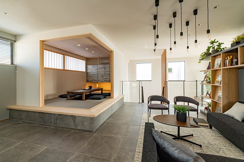 2階のラウンジの一角に、床を一段上げたモダンな和室がありました。手すき和紙を張った吊り押し入れやすっきりとしたデザインの內障子が小粋です。琉球畳とタイル床の色味がグレーでそろえられていて、洋の空間に和のしつらえが違和感なく調和しています。掘りごたつもあって、ほっこりとくつろぎたくなります。障子戸を閉めると個室になるので客間としても重寶しそうです。