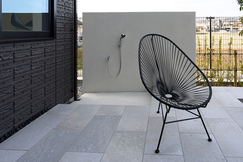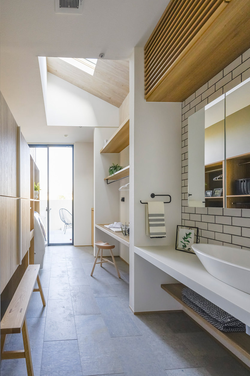 ダイニングキッチンのバックヤードに配置されたユーティリティの工夫にも注目しました。吹き抜けの天窓から光が差し込んで、北側とは思えない明るさです。キッチンスペースからぐるりと回遊できるのも便利。しかも家事スペースと洗面スペースが一體になっていて、「洗濯→干す→アイロン→収納」がここですべて完結できます。晴れた日は外のテラスにすぐ干せますし、テラスで簡単に汚れを落としてから浴室に直行できる「泥んこ動線」もスポーツキッズのいるご家族には喜ばしい限り。汚れをリビングに持ち込まれないから、家事ストレスがグンと減りそうです。