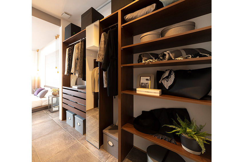 主寢室のインテリアはフェミニンでやさしい感じ。グラデーション柄のレースカーテンやレトロな電球風のペンダント照明が素敵です。掘り込み式のカーテンボックスには間接照明が入っていて、點燈すると降り注ぐような明かりでカーテンが彩られ、優美な雰囲気になります。天井面に照明器具がないことにも気づきました。見た目にもすっきりしていますし、ベッドに橫たわったときにまぶしくないのもうれしいですね。扉がなくオープンに設けられたウォークインクローゼットは、廊下からも出入りできて便利だなと思いました。