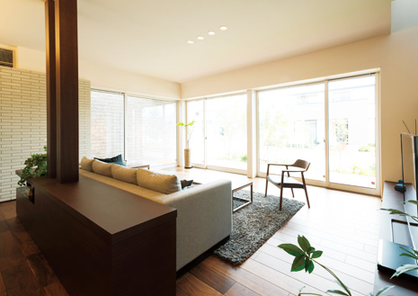 外壁と內裝のタイルの素材感を合わせ、あえて窓の外にタイル壁を見せると一體感が増し、視覚的な広がりを得ることができます。