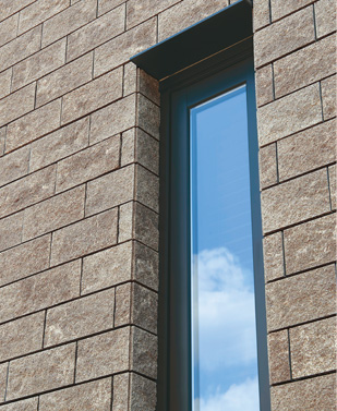 建物の重厚さを演出するため、窓まわりの部材の納まりにも配慮。窓枠を奧まらせたインセットウインドウ(奧付サッシ)などでタイル外壁の素材感を生かします。